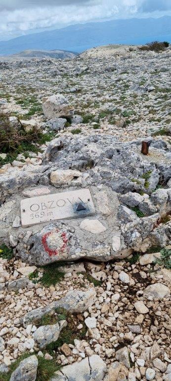 Obzova, najvišji vrh otoka Krka. Označen s piramido kamenja, marmorno ploščo z žigom, razgledom na vse strani in mrzlim vetrom, ki nam je bičal lice s tako silo, da smo si nadeli kapuce na glavo. Če ne bi bilo nizkih oblakov in meglic v daljavi, bi bil razgled veličasten. Nekaj osamljenih kapljic, predhodnic dežja nas je spomnilo, da se moramo vrniti. Vodnik je zapiskal v piščalko in romantike je bilo konec.