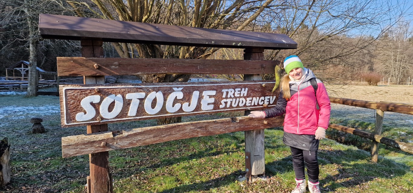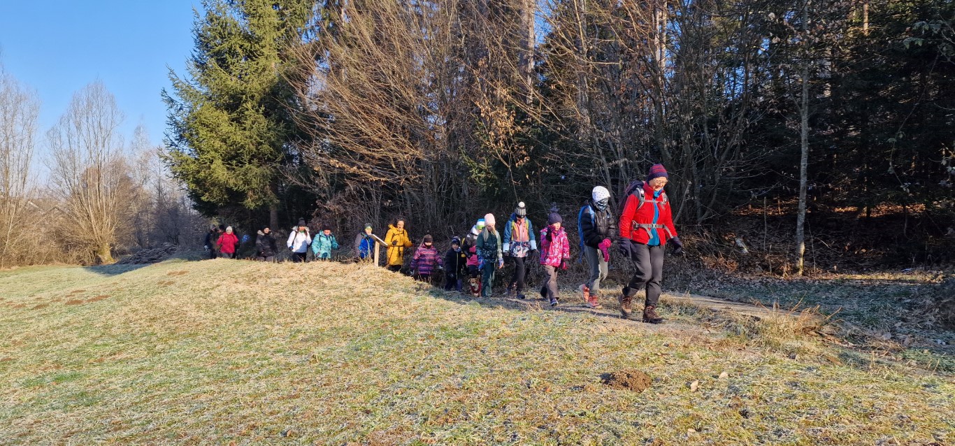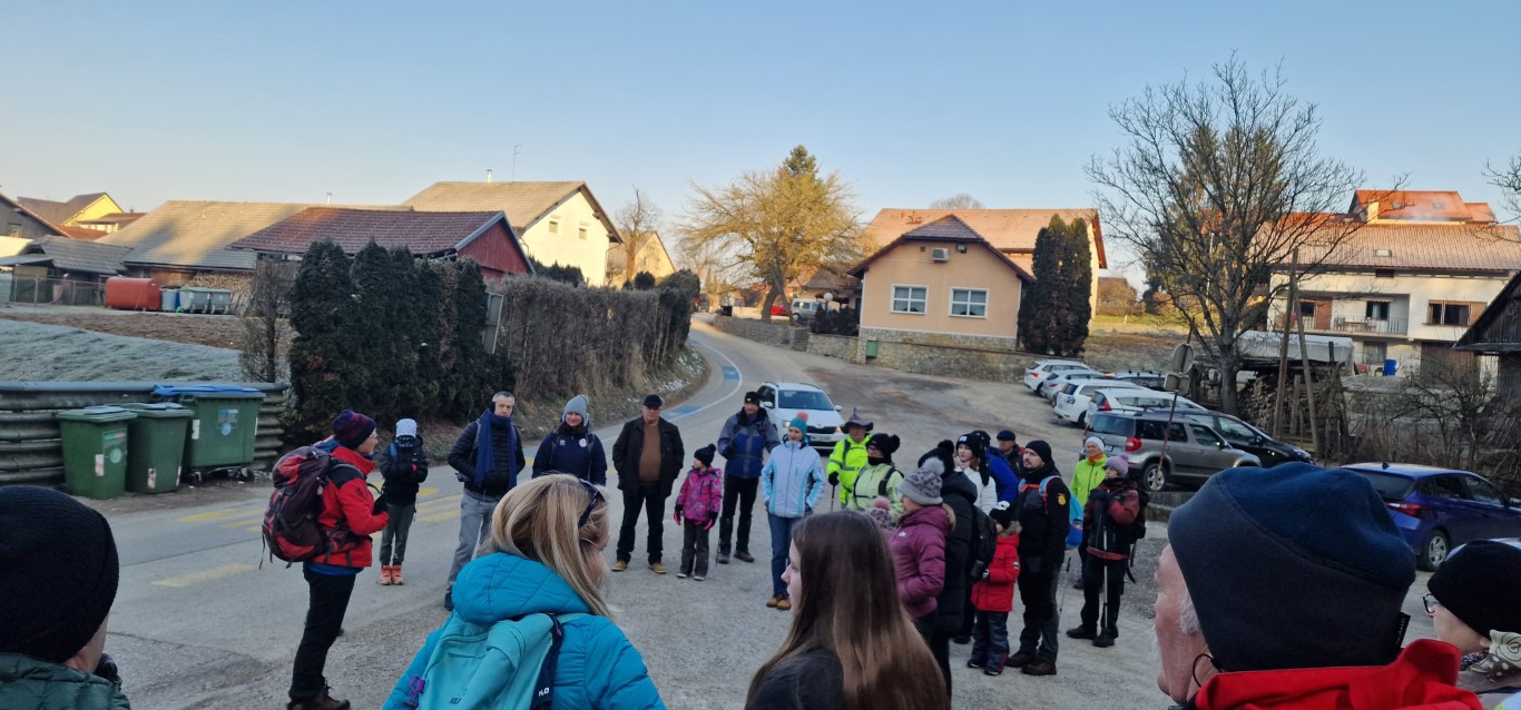 Pohodniki smo se v mrzlem jutru, - 7* C, zbrali na parkirišču pri gostilni Štefan na Malem Slatniku. Na pohodu nas je bilo 49 in še 2 prijazna psa. Po intervjuju, snemanju Vašega kanala smo se že malce shlajeni podali na pot, ki poteka po uhojeni stezi skozi gozd, ob Slatenskem potoku vse do Velikega Slatnika. Med hojo smo delali krajše postanke, da smo si ogledali naravne zanimivosti: mlinščico – umetna struga, ki vodi vodo na mlinska kolesa, glavate vrbe, izvire studenčkov; angelski studenček, Mrzliček, Mišjo pezdico, meandre Slatenskega potoka, lovske opazovalnice, okamenelega čuvaja, lepo urejena počivališča, mostičke, glavati gaber. O vsem opazovanem sem jim povedala nekaj zanimivosti. Pri sotočju treh studencev smo si ogledali glavni izvir studenca, jaslice, mlinček in skrbno urejen prostor za počitke, malico. Na vznožju pod vasjo smo si ogledali vremensko postajo in obeležje v spomin dolenjskemu vremenskemu napovedovalcu – Robiju Erjavcu. Na pokopališču smo si ogledali grob družine Mach.
