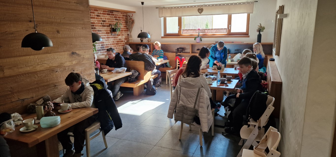 V gostilnici Slatnik nas je prijazno sprejela gospa Karmen Luzar, nam postregla z željeno pijačo in nam dovolila malicati priboljške, ki smo jih prinesli v nahrbtnikih. V toplem prostoru nam je bilo prijetno. Okrepčani smo nadaljevali s hojo. V drugem delu poti smo si ogledali skedenj – obnovljen ostanek graščine, zakleti oreh, škratovo uho, mokrišče in palčkov grad. Sproščeni, zadovoljni, da smo se skupaj razgibali, se medsebojno spoznavali in doživljali čarobnost Machove poti smo se v soncu vrnili na izhodišče. Lepo nam je bilo.